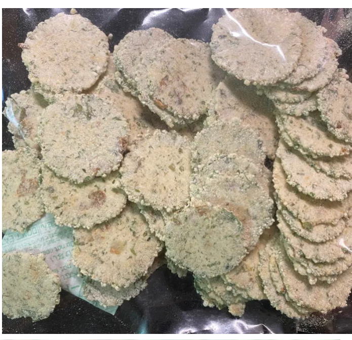無印良品を運営する良品計画(東京)の協力を得て、加工でんぷんにエビ粉とアオサを材料にした難波葱のせんべいも作った 良品生活。